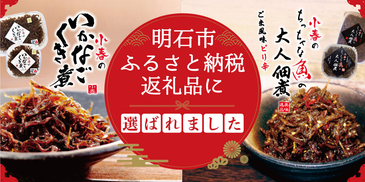 明石名物「小春のいかなごくぎ煮」春の風物詩として親しまれている「いかなご」水揚げされた「いかなご」を新鮮なうちに小春ならではの味付け、無添加にこだわりソフトな口当たりになるように仕上げました。